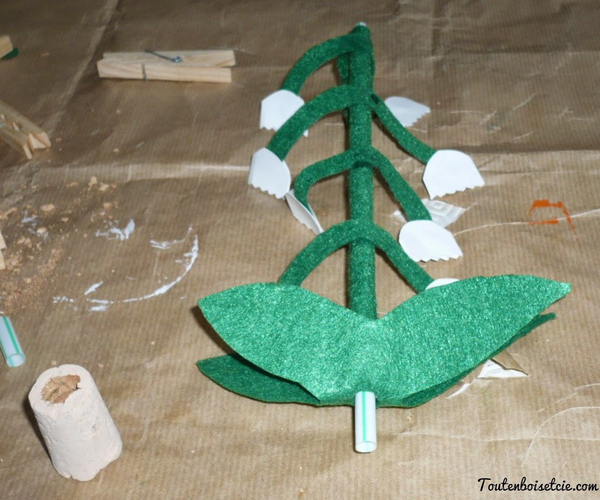 Découpe dans le restant de la feutrine les feuilles de ton brin de muguet et demande à un adulte de faire un trou dans le bouchon de liège.